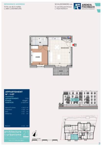 L'appartement 1-07 de 43.16 m2 se compose comme suit: